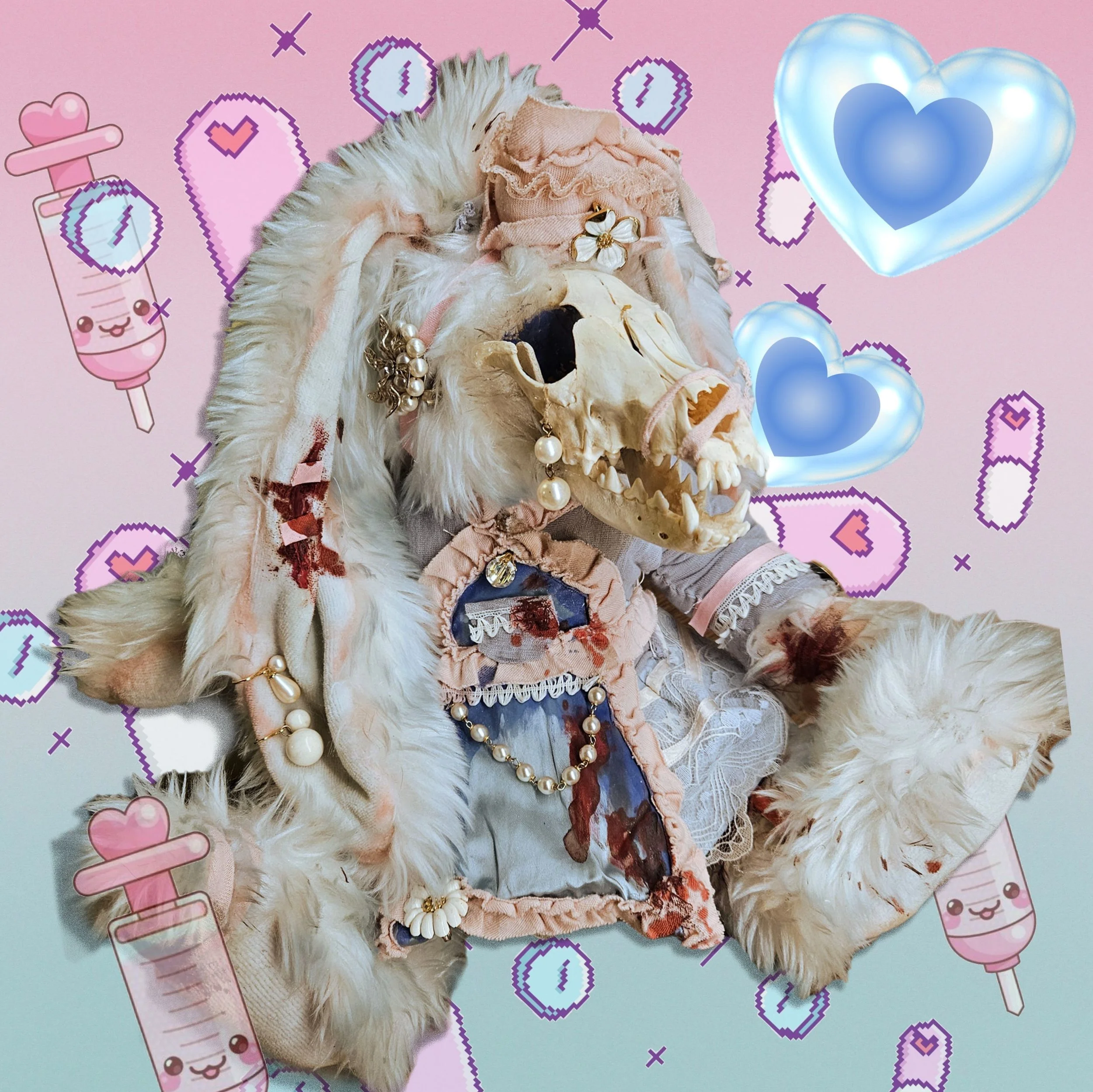 Custom fantasy dolls were the item that began Possum Hands, and are still my most popular item! I love to pair damaged animal skulls with damaged plushies, creating a haunting new character. Once the skull is in place, I like to spend time creating a backstory for each doll, this way each trinket I add and each piece of material I sew on has a purpose and a personality!